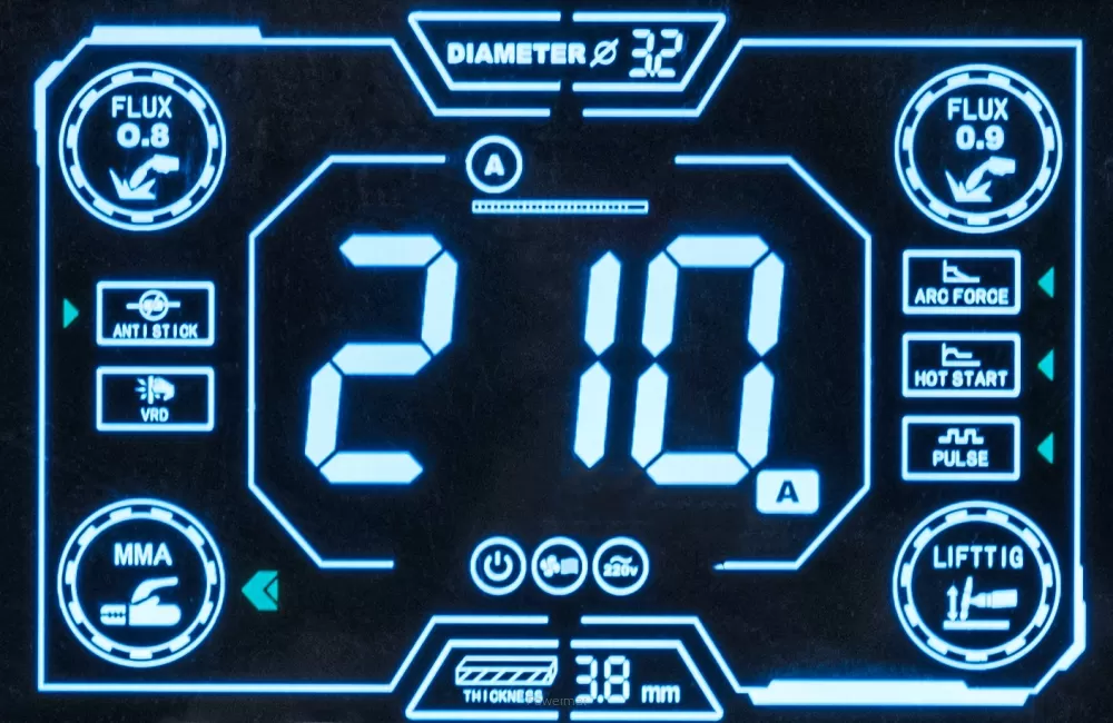 • ARC FORCE (automatyczny) stabilizuje łuk niezależnie od jego długości. Zmniejszając wartości funkcji daje łuk miękki i mniejszą głębokość wtopu, natomiast zwiększając wartości funkcji powoduje głębsze wtopienie i możliwość spawania łukiem krótkim. Przy największej wartość dla funkcji ARC FORCE możliwe jest „wciśnięcie elektrody w jeziorko roztopionego metalu i przepalenie materiału na wskroś.